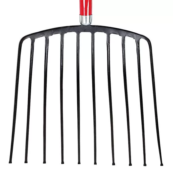 Ideal for mulch, vegetables, ensilage and more. This tool has 10 forged steel tines which are 15.5 inches long and 17 inches along the tine curve. 15 inch wide head has 1.625-inch tine spacing. 30-inch D-grip handle. Shipping weight of 7 lbs.