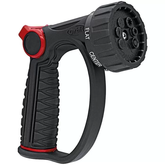 The Orbit Thumb Control D Grip Contractor Turret Pistol Nozzle features 7 spray patterns, a thumb control knob for adjusting water pressure, contractor grade construction for durability, a non-slip grip and contoured design for comfort and easy storage, a non-corrosive exterior, and a soft touch dial guard for easy selection and changing of spray patterns.
