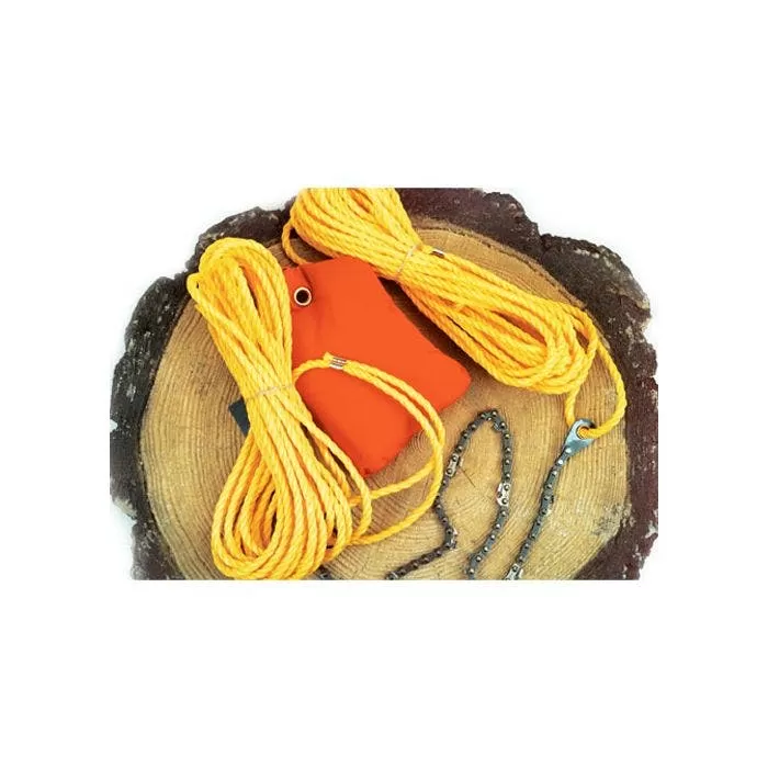 A Patented chain saw blade construction features BIMATIC carbon steel cutters for two-way cutting action. This custom made chain saw blade is engineered for hand use and offers maximum cutting efficiency. Comes complete with throwing weight and two 25′ control lines for a full 54′ overall length. Trim branches up to 30′ or higher! Comes with instruction booklet, and handy vinyl carrying pouch. Simply sharpen the blade in the same manner as a conventional chain saw blade, with 5/32″ circular file. 100% Made in the USA!