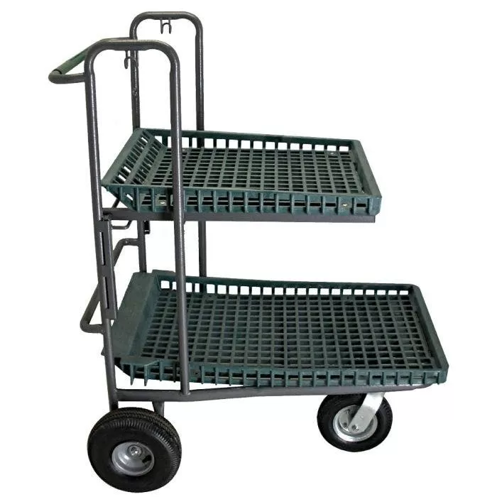 The Garden Center Cart features heavy duty plastic trays that allow for easy nesting for storage and flip up out of the way when not needed. It also includes handle hooks for hanging baskets or purses, and cup holders for your beverages, making it great for Garden Centers everywhere. The oval tube base provides extra stability and strength.