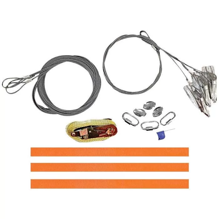 The Gripple Palm Bracing Kit contains three GBA34 Ground Anchors with attached cables, three medium fasteners with a release key, three quick links, and three pieces of safety webbing.