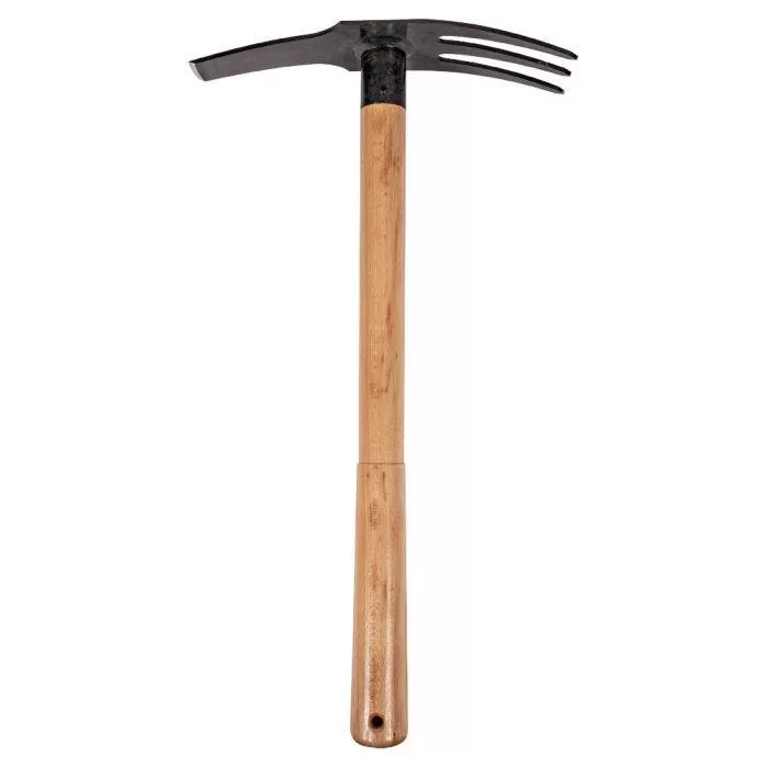 The Culti Dag is a two-sided garden tool that features a cultivator end with three 3″ tines and a narrow dagger end that tapers to a 1″ width and is sharpened for use as a pick. Its carbon steel tool head is heat-treated for durability and edge retention. The broad end of the blade is a consistent 2 1/2″ width, ideal for raking and cultivating even the toughest soils. It is equipped with a 15″ wood handle and has an overall blade length of 8 3/8″.