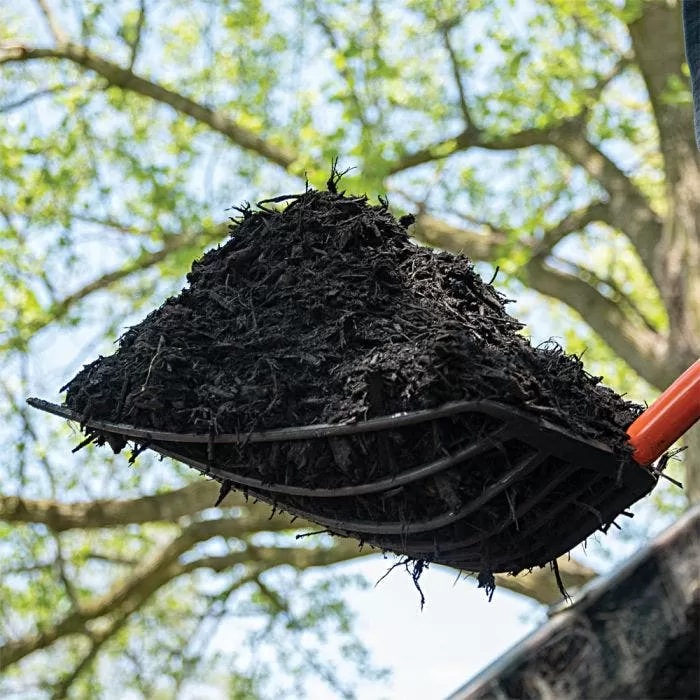 - Beveled tines and shovel-like configuration pick up more material per scoop