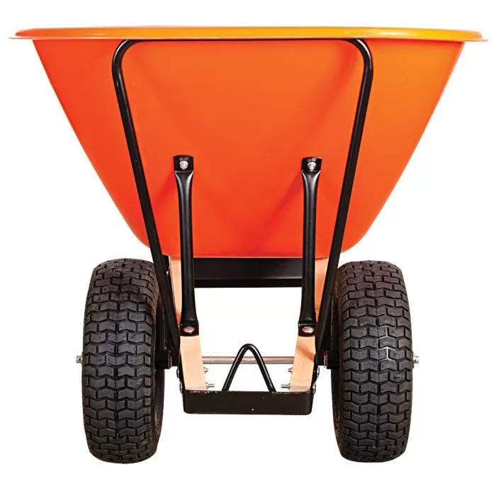 This Leonard 10-Cubic-Foot Capacity Poly Tray Wheelbarrow features a durable orange ABS plastic tray. We equip this wheelbarrow with extra-thick hardwood handles. These handles measure 1-5/8-inch by 2 inches and are 5 feet in length. Leonard Wheelbarrows feature a welded tray support, wide carriage bolt heads, and a heavy-duty undercarriage.