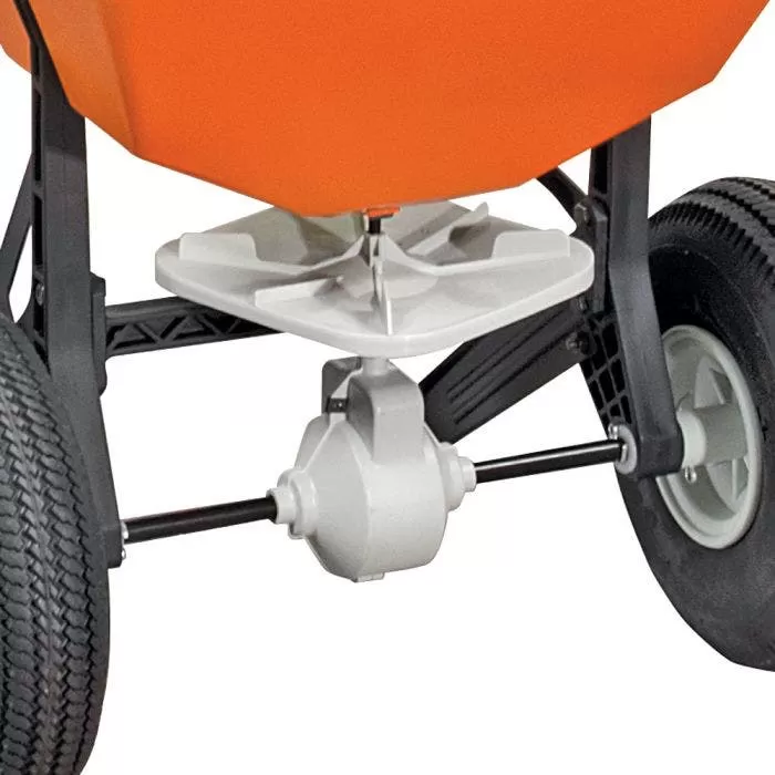 The overall width of the spreader is 22 inches and it has 10″ diameter pneumatic tires. The hopper cover and an epoxy powder coated steel frame ensure increased corrosion resistance to salts and fertilizers. The gears are also fully enclosed and made of self lubricating Nylatron GS for durability.