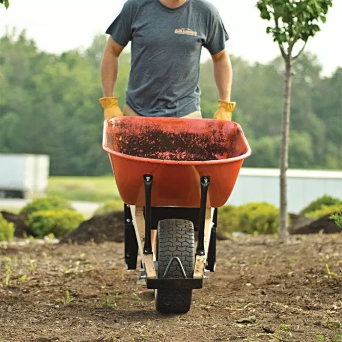 These 6-cubic-foot wheelbarrows support up to 500 pounds. Their welded tray support improves both durability and performance; however, you can choose to omit the brace for a lighter wheelbarrow. The combination of features and low-profile design increases stability. This increased stability allows you to transport even the most substantial loads over uneven surfaces with ease. A narrow profile allows the wheelbarrow to fit through most common doorways and gates with ease.