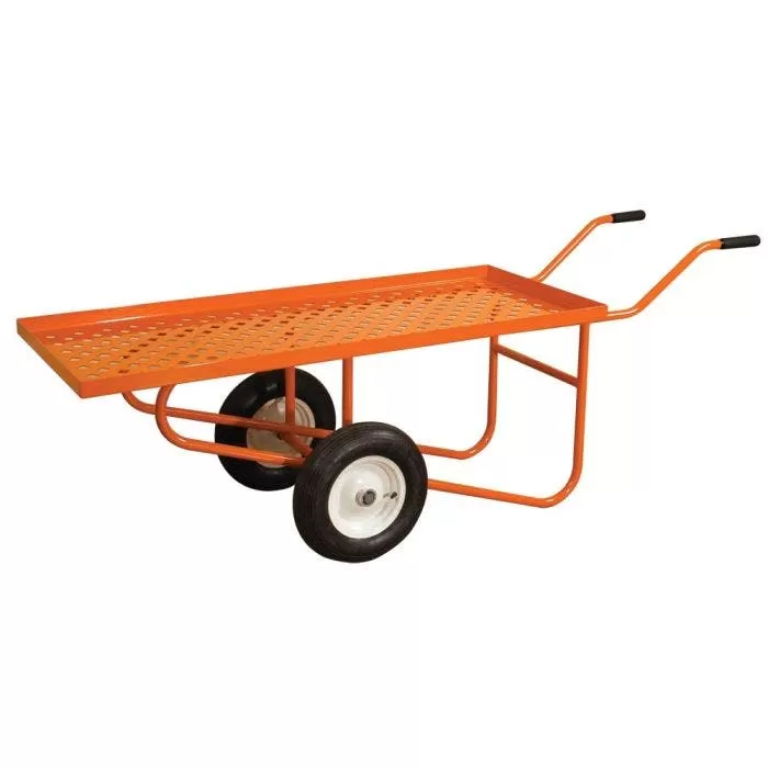 The Leonard Flatbed 2 Wheel Nursery Cart features one-piece welded construction with thicker 11 gauge steel diamond punched decks and 1 and 1/8 inch steel tubing for increased durability. The extended deck is supported by a rigid, fully welded frame and the cart has a premium powder-coated, durable, and distinctive orange finish.