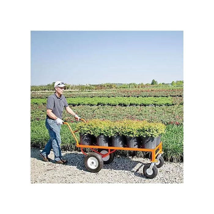 Leonard 4-Wheeled Push-Style Nursery Carts have a diamond-punched deck made from 11-gauge steel. This deck measures 24 inches (2 feet) in width by 60 inches (5 feet) in length. We make the durable, one-piece welded frame using 1-1/8-inch diameter steel tubing. We weld a handle to a heavy-gauge, 3/16-inch plate and bolt it directly to the frame. Finally, we apply a premium powder-coat in our signature orange color. This cart has two 16-inch tires in the rear and two 10-inch tires under the swivel caster. Choose your desired tire type below. Leonard Nursery Carts move nearly anything and hold up to 1,000 pounds! They are ideal for flats, potted shrubs, or bagged materials. The deck maintains a flat surface, and the 1-1/2-inch side lips prevent materials from sliding off. The diamond-punched grid makes the cart lighter and allows water to drain instead of pooling on the deck. Leonard 4-Wheeled Nursery Carts are the best in the industry. We engineer them to be durable yet still light enough to maneuver easily. Our carts easily outlast those cheaply-made assembly line imports. We back this quality by covering these carts with our lifetime warranty! Double your space with one of our Steel Add-On Shelves. You can also Combine a Flat-Free Cart and Shelf and save some cash! These products must ship via motor freight delivery. They are not eligible for any free or reduced shipping offers.