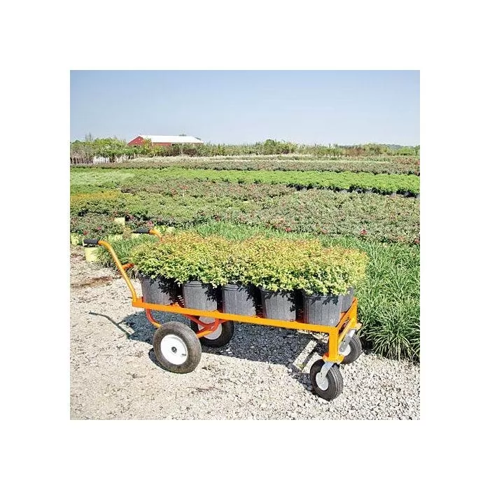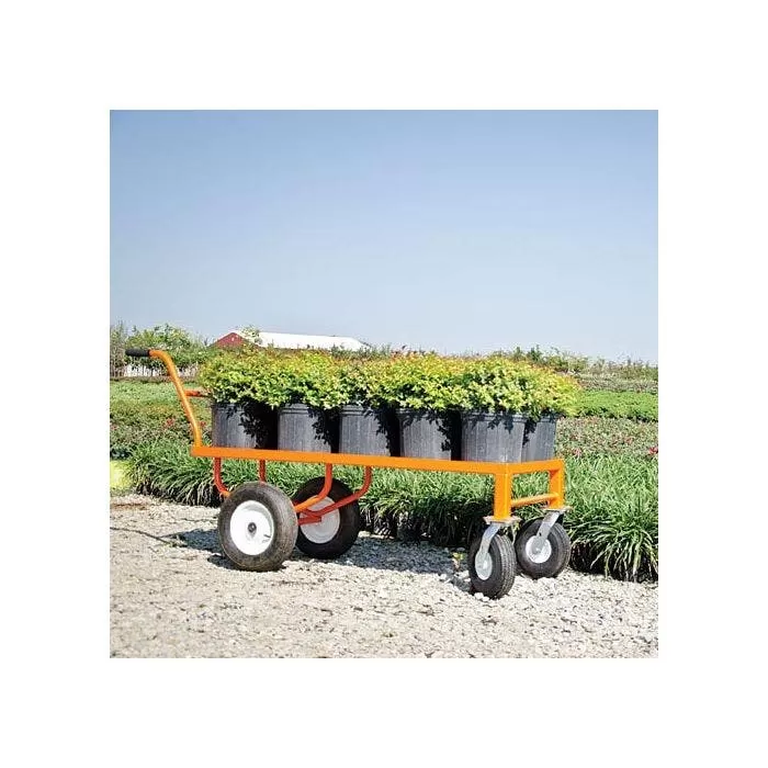 We outfit this cart with four pneumatic tires; two 16-inch tires in the rear and two 10-inch tires under the swivel caster. Use Leonard Nursery Carts to move nearly anything. They are ideal for flats, potted shrubs, or bagged materials. The deck maintains a flat surface, and the 1-1/2-inch side lips prevent materials from sliding off. The diamond-punched grid makes the cart lighter and allows water to drain instead of pooling on the deck.