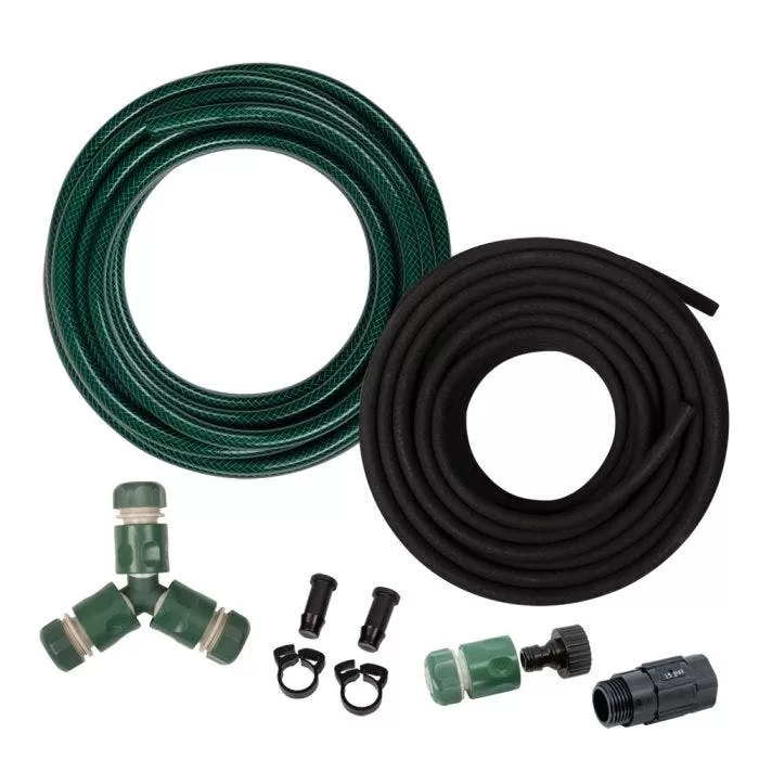 The soaker hose included in the kit is made of rubber and is 100 feet long with an inside diameter of 1/2 inch (12mm) and an outside diameter of 5/8 inch (16.5mm). The garden hose is made of PVC and is 65 feet long with a diameter of 1/2 inch. The pressure regulator included in the kit is 15 psi.