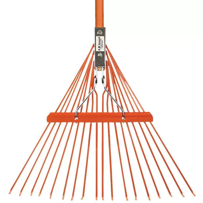 The Leonard Spring Rake features a rake head with a width of approximately 16 inches and 18 tines, providing a versatile tool for raking leaves, grass, or other debris, moving mulch, wood chips, or gravel, and cleaning out beds or de-thatching lawns.