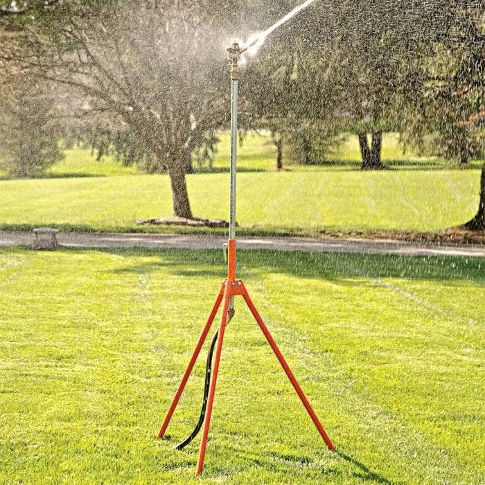 The sprinkler head of the Leonard Tripod Tower can spray up to 90 ft in diameter, making it suitable for watering large areas with ease.
