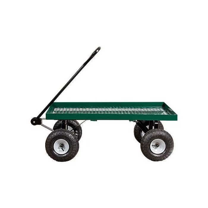 The Metal Deck Wagon 20 in x 38 in is versatile with durable construction and easy maneuvering. It has an expanded mesh deck, anti-tip style steering, and a durable powder-coated finish. The wagon also comes with convenient long handles and easy-rolling 4″ x 10″ pneumatic tires. The wagon has a 1-year manufacturer’s warranty, 20 in x 38 in deck size, 2″ lip around the deck, and a ship weight of 53 lbs.