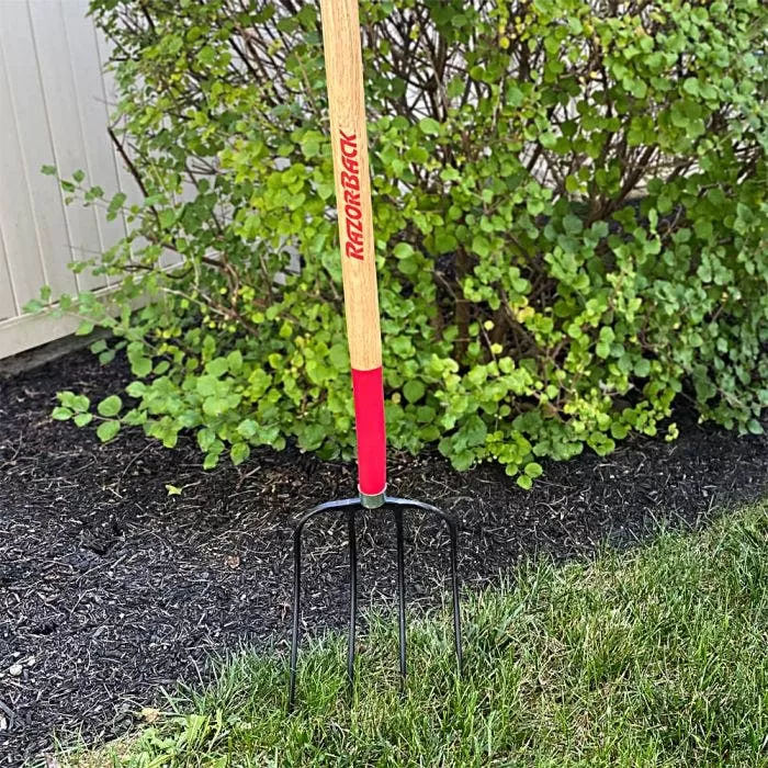 The Razor Back Forged 4 Tine Manure Fork is made of a single piece of steel with a 48 inch hardwood handle and a Flex Beam® connection.