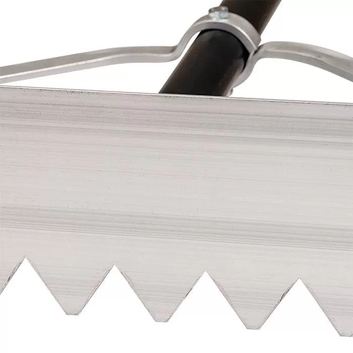 The Razor-BackLute Rake features an all-aluminum design. The 36-inch wide head features sharp, pointed teeth on one side and a level, smooth blade on the other. This head connects to an 82-inch long handle complete with a comfortable end grip. A wrap-around brace provides a strong head-to-handle connection.