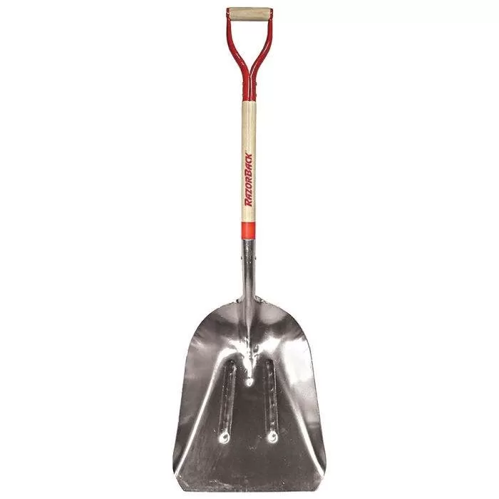 Razor-Back® Western Pattern Scoops feature an aluminum head. The western pattern blade has ribs to maximize its overall strength. This lightweight head attaches to a 31-inch hardwood D-grip handle. A steel cover encases the D-grip handle, preventing twisting and breaking during use. Choose your desired size below. Razor-Back® Western Pattern Scoops are perfect for scooping and moving materials. Use them to transport grain, seed, fertilizers, or other granular materials. They also work well for general cleanup of mulch, sand, or soil. Razor-Back® Aluminum Scoops provide the perfect mix of weight and durability. Aluminum naturally resists rust, allowing these scoops to last through seasons of use. Razor-Back® backs these scoops with a lifetime warranty!
