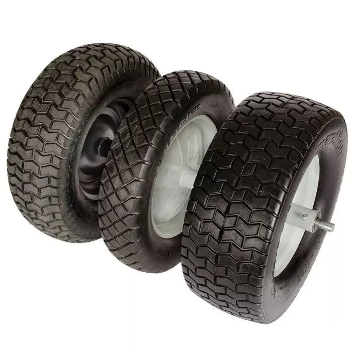 Wheel measures 16-inch. Choose from Wide Turf Tread Flat-Free or Pneumatic Tire, or Narrow Diamond Tread Flat Free Tire. Sealed bearings with grease zerk. Welded steel rim. Ship wt 10 lb