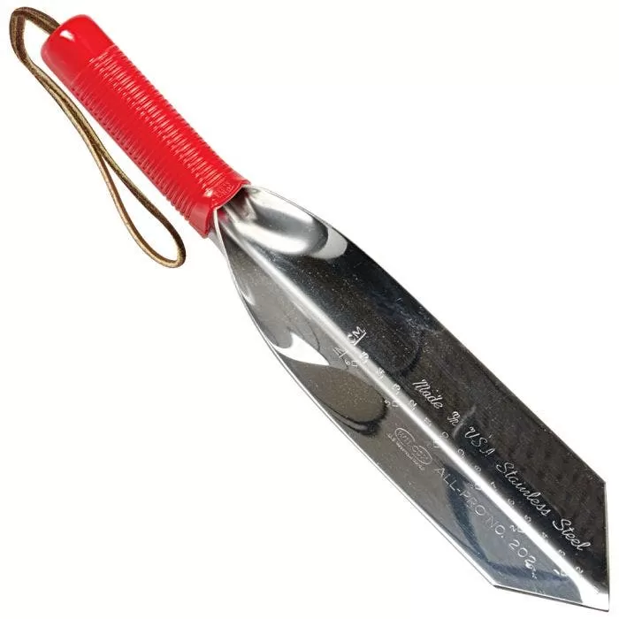These professional grade stainless steel trowels are constructed of a single piece of 16 gauge metal. Featuring depth markings up to 6 inches or 15 cm. 4 1/2″ plastic grip with leather hand strap (not shown). 3″ x 14″; Ship Wt. 1 lb. Wilcox proudly makes this product in the USA and covers it with a lifetime warranty.
