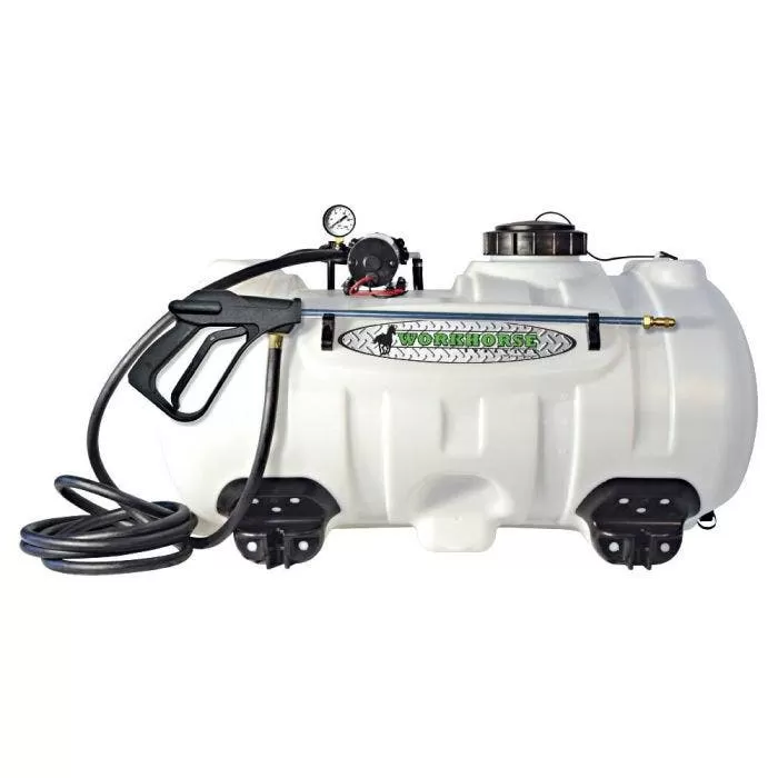 Green Leaf equipped this sprayer with a sturdy polyethylene tank. A large fill opening means less chance of spilling your expensive solutions. The PowerFlo™; 2200-Series pump allows for pressure adjustments from 0 to 60 PSI. Maximum PSI products a strong stream of up to 30 feet at 2 gallons per minute! Workhorse Spot Sprayers include a pistol-grip handgun. Greenleaf outfitted this with a 15-foot hose and an adjustable brass tip. An 8-foot wiring harness includes battery clips and switch. They also equipped this sprayer with an inline shut-off for a quick on/off spray. Turn your ATV or trailer into a sprayer vehicle with the WorkHorse Boom Kit. Find it HERE. See below for buying options.